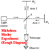 Michelson and Morley built an apparatus, called an interferometer, that would measure even the slightest phase difference between light beams traveling equal lengths* perpendicular to one another. If one arm of the apparatus was in the direction of the earth's absolute motion, then this beam would be slowed by the factor gamma, and a different interference pattern would be measured. I've set up this experiment for you right now. In your applet window I have two light pulses travelling perpendicular to one another. Press start to send them off towards the reflecting mirror. With this set-up, which statement best describes the motion of these particles: (Notice that currently you are in the Object's frame, just as Michelson and Morley were.) A) The photon parallel to the motion of the apparatus is slowed. B) The motion of the photons are unaffected by the motion of the apparatus. C) The photon parallel to the motion of the apparatus is sped up. Choose an answer and press Next. |
