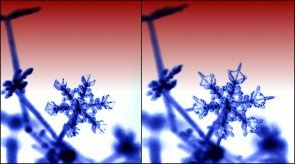 Two shots of a cluster of numerous snow stars growing on electric needles. |