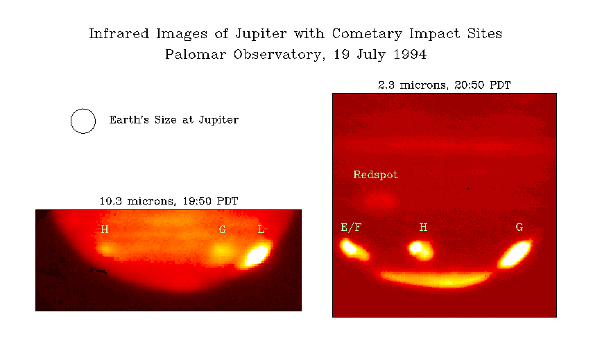 The image on the right shows Jupiter at a wavelength of 2.3 microns about 1 hour later. Since the first image, the planet has rotated about 36 degrees, site L has disappeared off the right limb, and sites E and F have appeared on the left. Most of Jupiter is faint at this wavelength because methane in its upper atmosphere absorbs the incident sunlight before it reaches the main cloud deck. We believe that the impact sites, on the other hand, are bright due to the scattering of light from residues of the cometary impacts deposited at high altitudes. Also visible in this image is the famous Great Red Spot, a bright band north of the equator, and the South Polar Hood, all of which are normally visible on Jupiter.