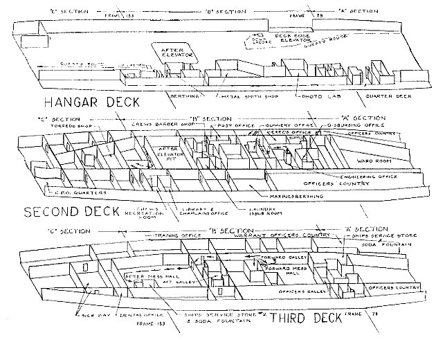 LOCATING SHIP'S FACILITIES - Finding your way around the ship will be much easier if you will remember the system used to identify the various spaces. The ship as a whole is divided into three sections: Forward, Amidships, and Aft, and these are designated A, B, and C, respectively. Frame 79 is the dividing line between the A, and B, sec- tions; Frame l53 between the B and C sections. The decks. of the ship are numbered from the Hangar Deck downward: 1,2,3, etc. Compartments are numbered in sequence, start- ing at the bow of the ship, with the even numbers always on the port side. A further designation is made according to the use made of the compartment, as L for living, E for engineering, etc. lf a compartment is subdivided a number will appear with this letter, as 3L, 2E, etc. To illus- trate, a compartment might be designated as 'B-3l6-L' in which case the B indicates that the compartment in the Amidships section, 3 indicates that it is on the Third Deck, the 16 indicates that it is on the Port Side and is the sixteenth compartment aft of Bulkhead #79 on that deck and the L indicates it is used as a living space. |